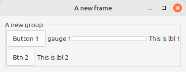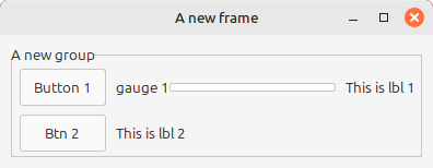 (require racket/gui) (define win (new frame% [label "A new frame"])) (define grid-group (new group-box-panel% [label "A new group"] [parent win] [horiz-margin 10] [vert-margin 10])) ; Adding the columns pane with 3 columns (define h1 (new horizontal-pane% [parent grid-group])) (define btn1 (new button% [parent h1] [label "Button 1"])) (define g1 (new gauge% [parent h1] [stretchable-width #t] [label "gauge 1"] [range 100])) (define lbl1 (new message% [parent h1] [label "This is lbl 1"])) (define h2 (new horizontal-pane% [parent grid-group])) (define btn2 (new button% [parent h2] [label "Btn 2"])) (define lbl2 (new message% [parent h2] [label "This is lbl 2"])) (send win show #t)
