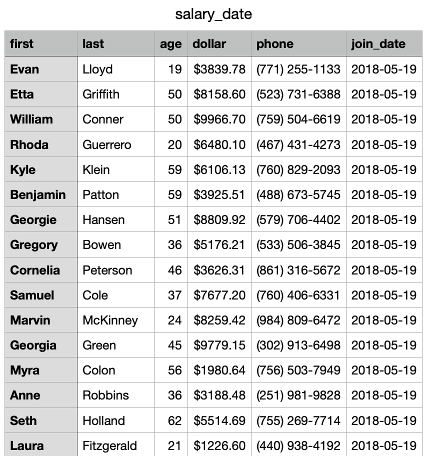 ; no schema (define salary-data-frame-csv-no-schema (load-csv-file "../sample-csv/salary_date.csv" #:schema #f)) (data-frame-head salary-data-frame-csv-no-schema)